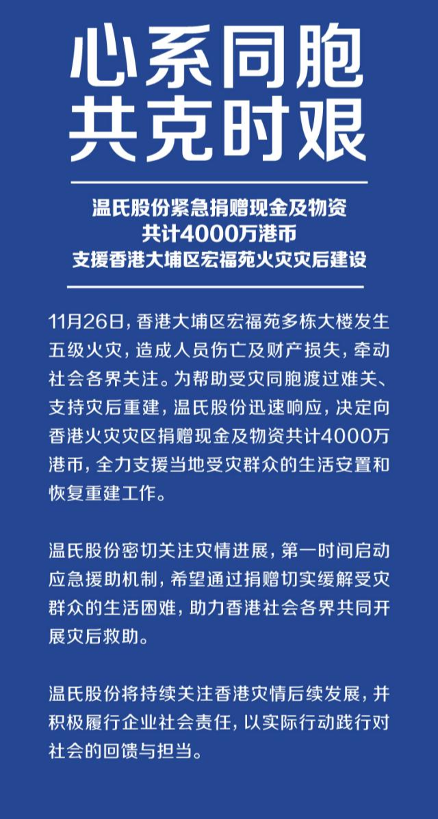 这家云浮企业捐赠4000万港元支持香港火灾后重建