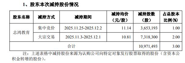 中国经济网北京12月4日电 世纪天宏(300654.SZ)昨晚发布控股股东减持方案完成情况公告。近日,公司收到控股股东新疆志宏教育投资(集团)有限公司(以下简称“志宏教育”)出具的《减持计划完成通知书》。截至公告日,志宏教育减持计划期限已满,减持工作已完成。 2025年11月3日至2025年12月2日,志宏教育通过集中竞价及竞价交易方式合计减持公司股份10,971,493股,占公司总股本的3.00%。公告世纪天宏显示,2025年11月25日至2025年12月2日,智宏教育通过集中竞价减持3,653,193股,均价11.1-4元/股; 2025年11月3日至2025年12月1日,志宏教育通过大宗交易减持731.83万股,减持均价10.81元/股。经测算,志宏教育减少扣除的成本为1.2亿元。世纪天宏披露,本次减持事项已按照相关规定进行了预披露。截至本公告日,该股权减持计划已到期。本次减持情况与此前披露的意向、承诺及减持计划一致。本次减持计划已实施。智宏教育作为公司控股股东,实施本次减持计划不会导致公司公司控制权发生变更,也不会对公司的管理架构和持续经营产生影响。