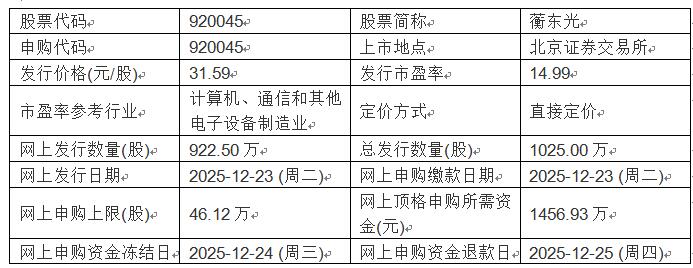 恒东光通信技术(深圳)有限公司 保荐机构(主承销商):招商证券股份有限公司 发行状况: 公司简介:公司专注于光通信领域无源光器件产品的研发、制造和销售。其主要业务板块包括无源光纤布线、无线连接器、光纤软线路产品、布线管理产品等光纤布线产品,以及多纤并行无源互连光器件、PON光模块无源互连光器件等互连光器件产品。截至招股说明书签署日,瑞发商贸直接持有公司44.76%的股份,并通过瑞创实业间接持有公司20.51%的股份。合计持有公司65.27%的股份,为公司控股股东。公司实际控制人为陈建伟。瑞发商贸直接持有公司44.76%的股份,瑞创实业直接持有公司20.51%的股份。陈建伟通过瑞发商贸间接持有公司31.33%的股份,通过瑞创实业间接持有公司14.35%的股份。间接持有公司股份合计45.69%,控制公司表决权合计65.27%。陈建伟能够对公司股东大会的决议以及公司董事、高级管理人员的任免产生重要影响。此外,陈建伟担任公司董事长,对公司经营和管理也能产生重要影响。因此,陈建伟为公司实际控制人。恒东光关于向不特定合格投资者公开发行股票并在北交所上市的公告京交所2025年12月19日显示,若本次发行成功,公司预计募集资金总额为32,379.75万元。扣除发行费用4591.91万元(不含增值税)后,预计募集资金净额为27787.84万元。恒东光2025年12月19日发布的招股书显示,公司拟募集资金49363.29万元,用于桂林制造基地扩建(三期)项目、越南生产基地扩建项目、总部光学研发中心建设项目及补充流动资金。